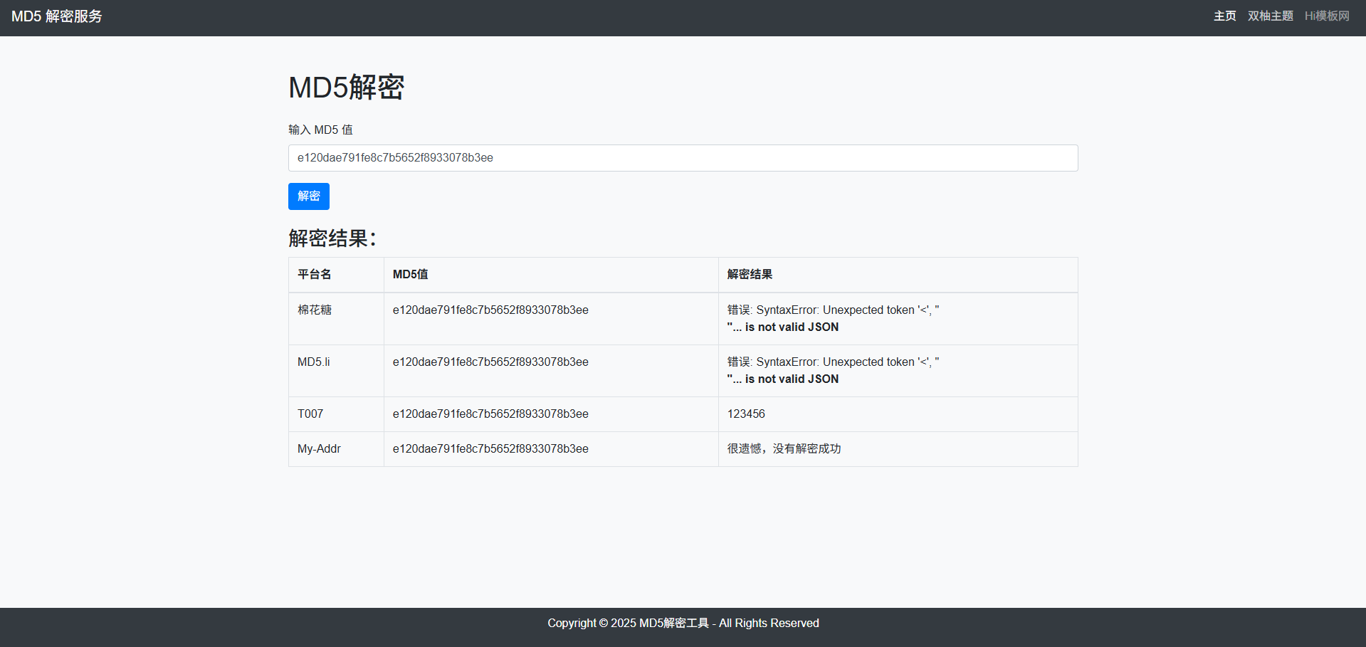 hmoban 建站笔记 2026-04-08 MD5在线解密网站源码/自带解密api MD5在线解密网站源码,源码内置4个解密api,免费直接使用(如果有些接口没用了 自行找下接口) 测试搭建环境:Nginx+PHP7.0 直接将压缩包上传网站目录解压即可 hmoban主题是根据ripro二开的主题,极致后台体验,无插件,集成会员系统双柚主题 » MD5在线解密网站源码/自带解密api